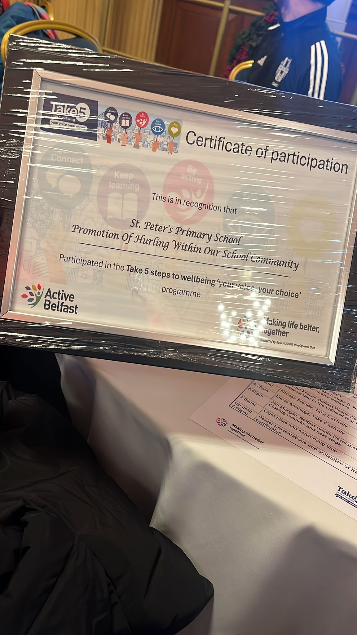 St Peter’s was recognised for its Promotion of Hurling Within Our School Community, receiving a Certificate of Participation from Active Belfast as part of the Take 5 Steps to Wellbeing – “Your voice, your choice” programme.